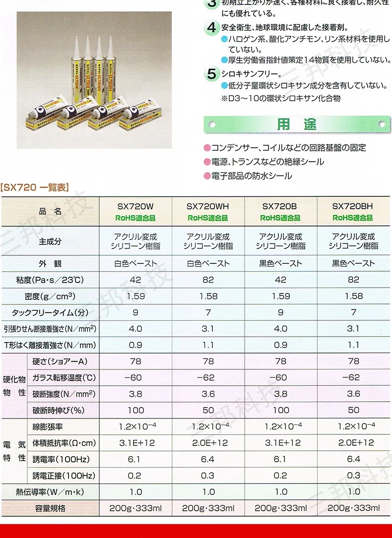 日本施敏打硬(Cemedine)的 SX720W 是一款性能非常出色的单组分、室温固化弹性粘合剂,特别适用于电子元件的粘接、密封和固定。下面是它的关键参数汇总 。