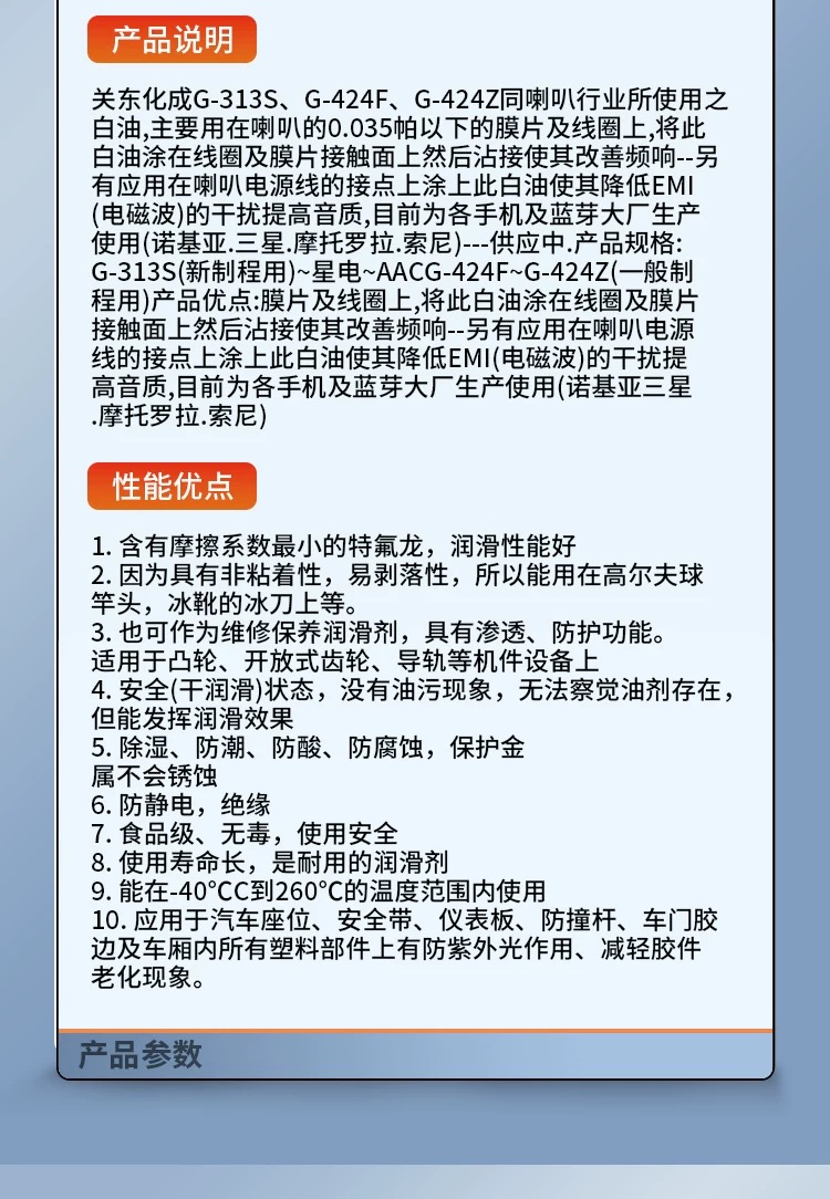 • 核心功能:G-424F主要用于润滑和保护电气接点,例如开关的触点。它能有效消除噪音(防止接触不良产生的电火花噪音),并减少电弧和磨损,从而延长元件寿命 。