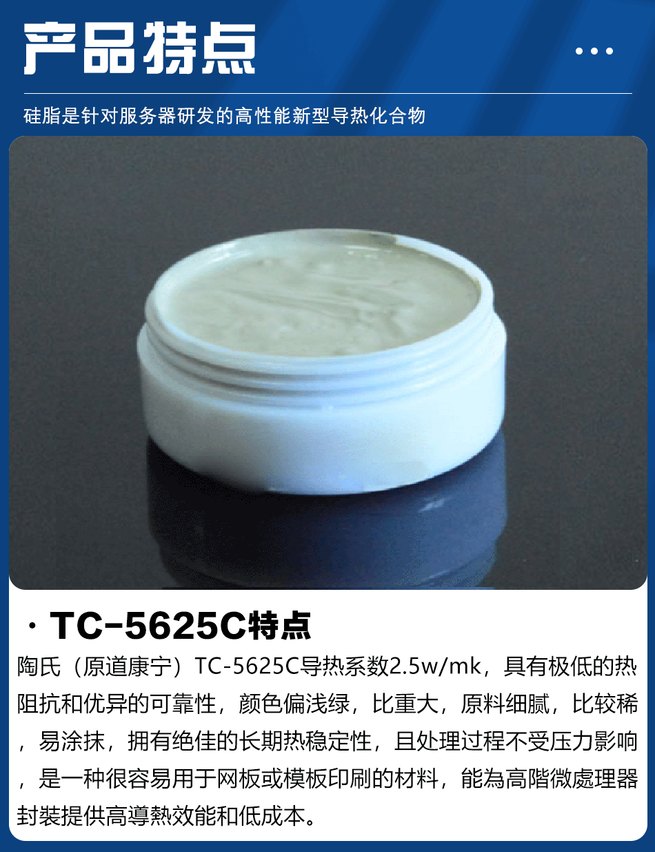 这些参数表明TC-5625C导热硅脂具有较高的导热率和良好的绝缘性能,适用于需要高效散热的高端电子设备。