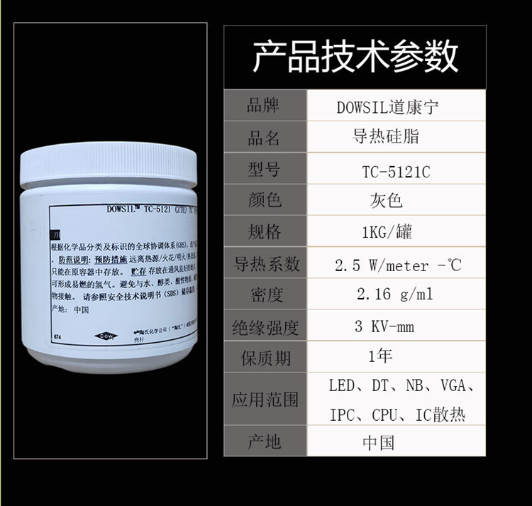 美国陶熙TC-5121C导热硅脂的具体参数如下: