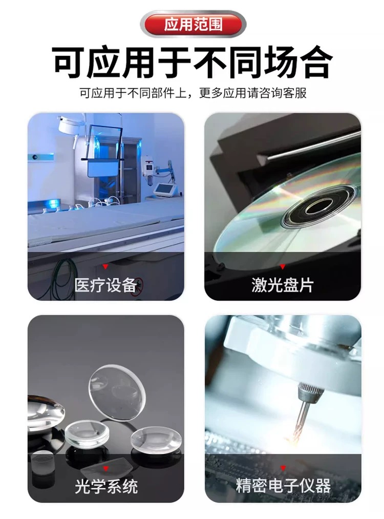 • 光学部件和医疗设备:用于清洁光学镜片、激光盘片及其他精密仪器,安全无腐蚀。
