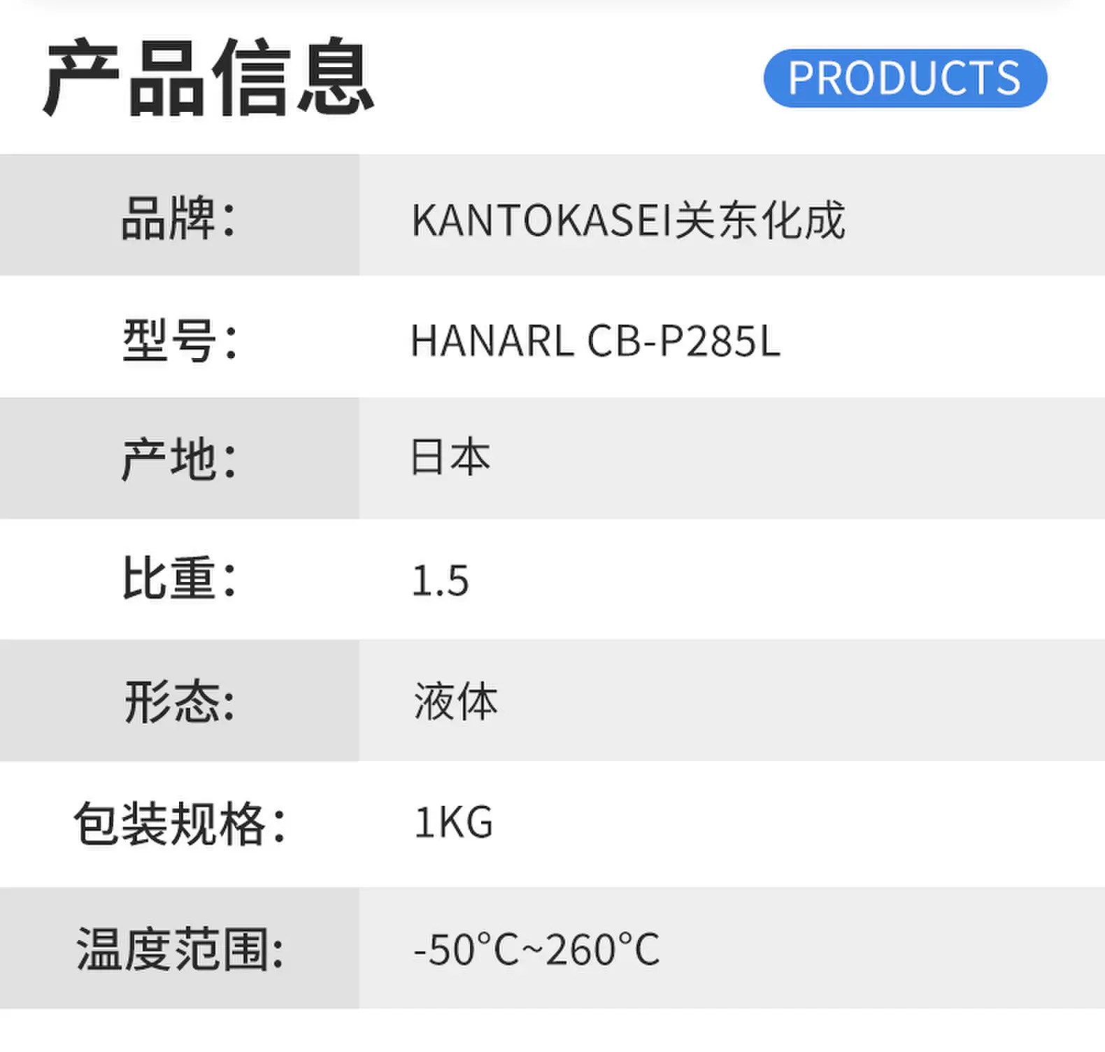 关于日本关东化成(Kanto Kasei)的 CB-P285L,根据有限的搜索结果,CB-P285L 似乎是关东化成旗下 HANARL 品牌系列中的一款 干性皮膜油 。