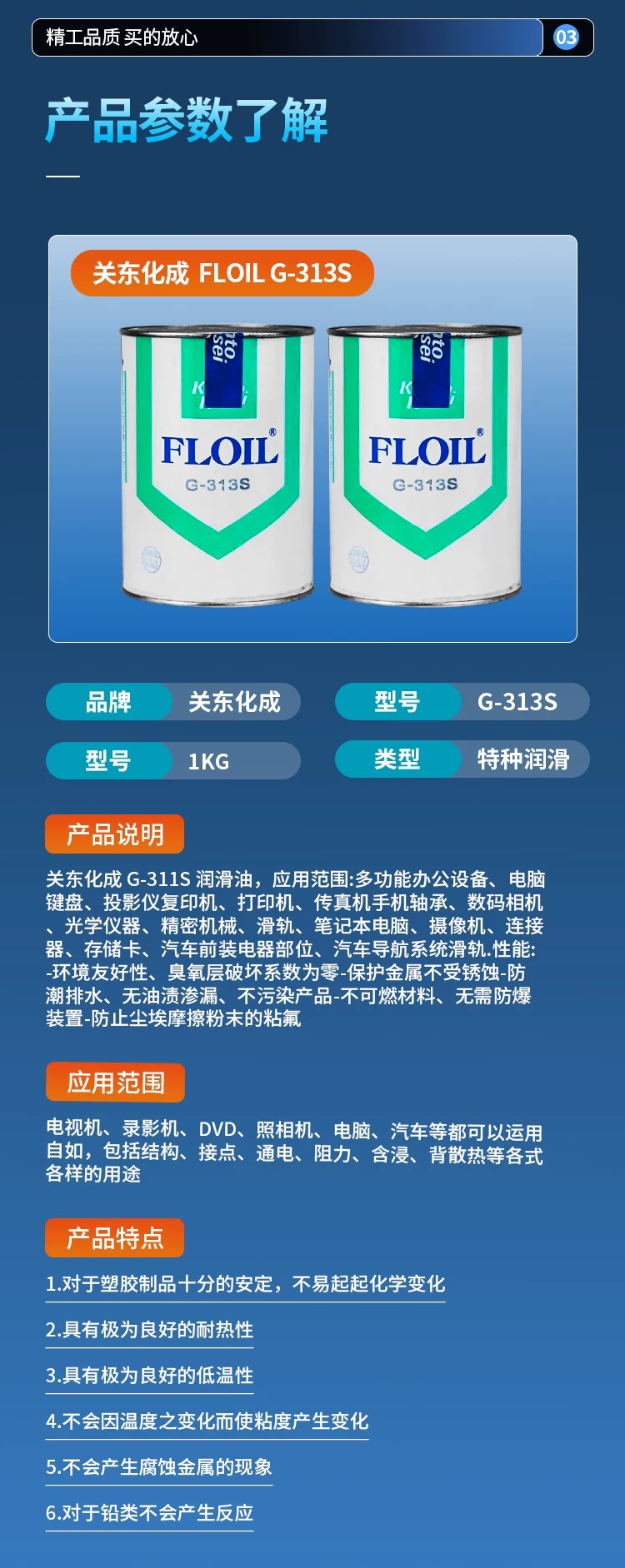 • 主要应用场景:G-313S专为电子精密设备的滑动、转动部件设计,广泛应用于各类开关的接点部、电脑键盘、复印机打印机、光学仪器、精密机械滑轨等场合 。其良好的电气特性使其特别适合需要同时保证润滑和电接触可靠性的部位 。