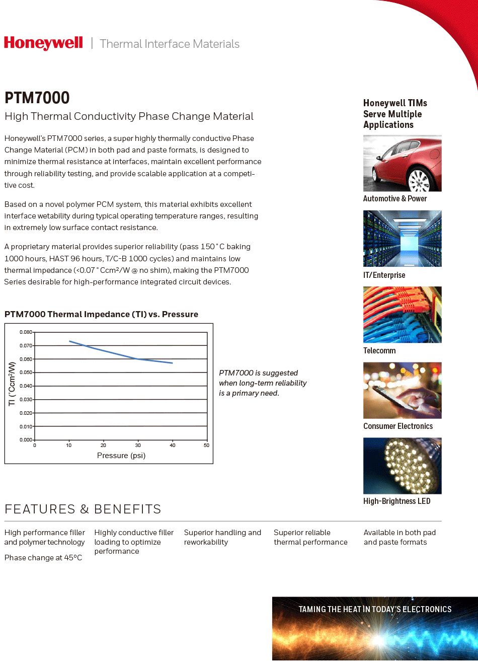 这些参数表明PTM7000系列适用于需要高导热性和良好热管理的多种应用场合,如功率控制单元、逆变器、车载电子设备、服务器、超级计算、视频图形阵列(VGA)卡、人工智能、GPU/CPU/台式机、固态硬盘(SSD)等。