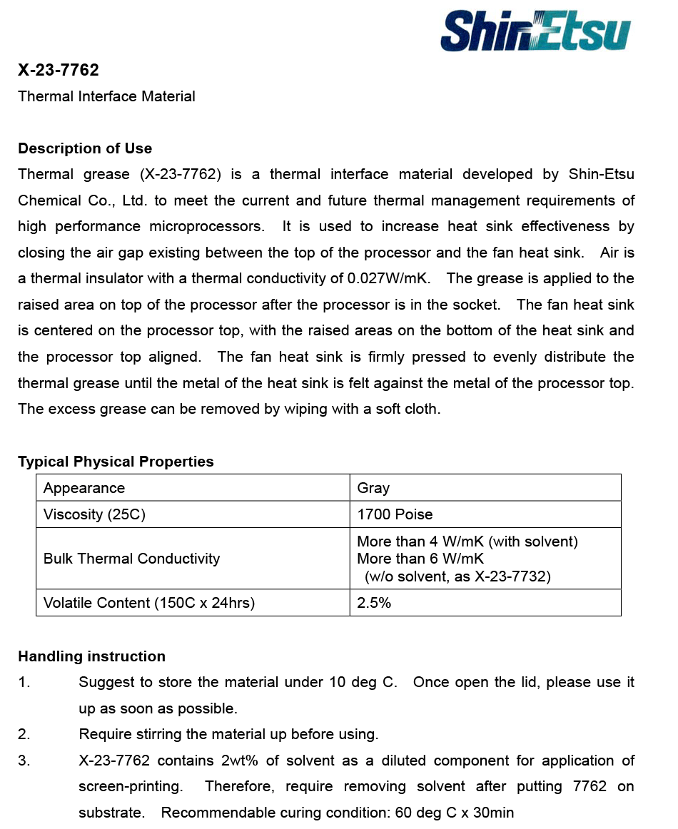 这些参数表明X-23-7762导热硅脂具有良好的导热性能和广泛的使用温度范围,适用于CPU、MPU等电子元件的高效散热。