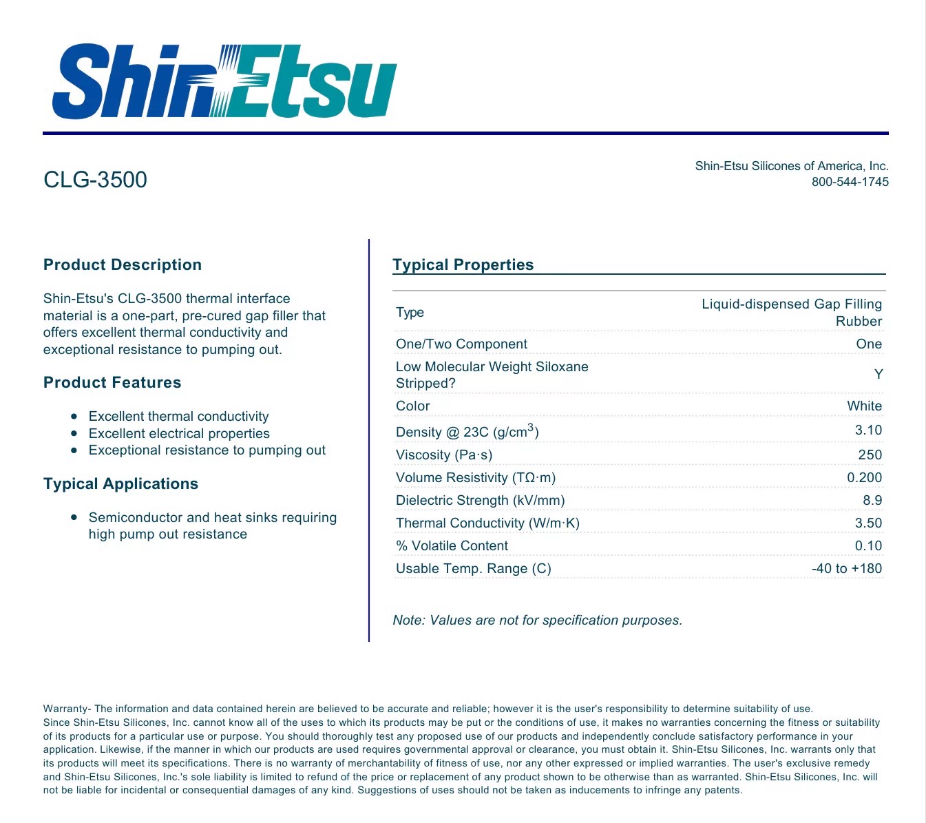 这些参数表明CLG-3500是一款适用于电子设备中需要高效热传导的场合,如CPU、IGBT模块等。