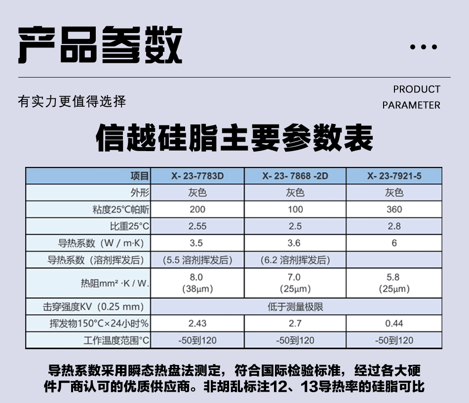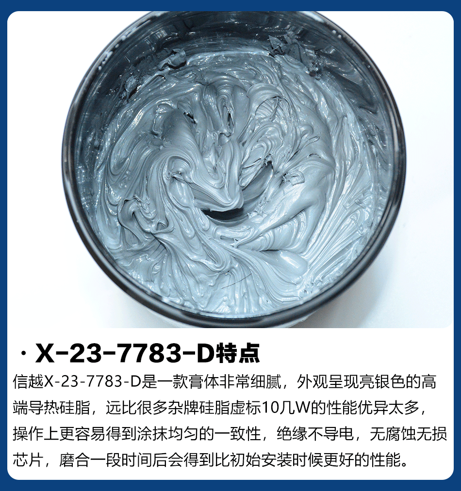 这些参数表明X-23-7783-D导热硅脂具有良好的导热性能和绝缘性能,适用于需要高效散热的电子设备,如CPU散热、LED灯具、电源模块等。