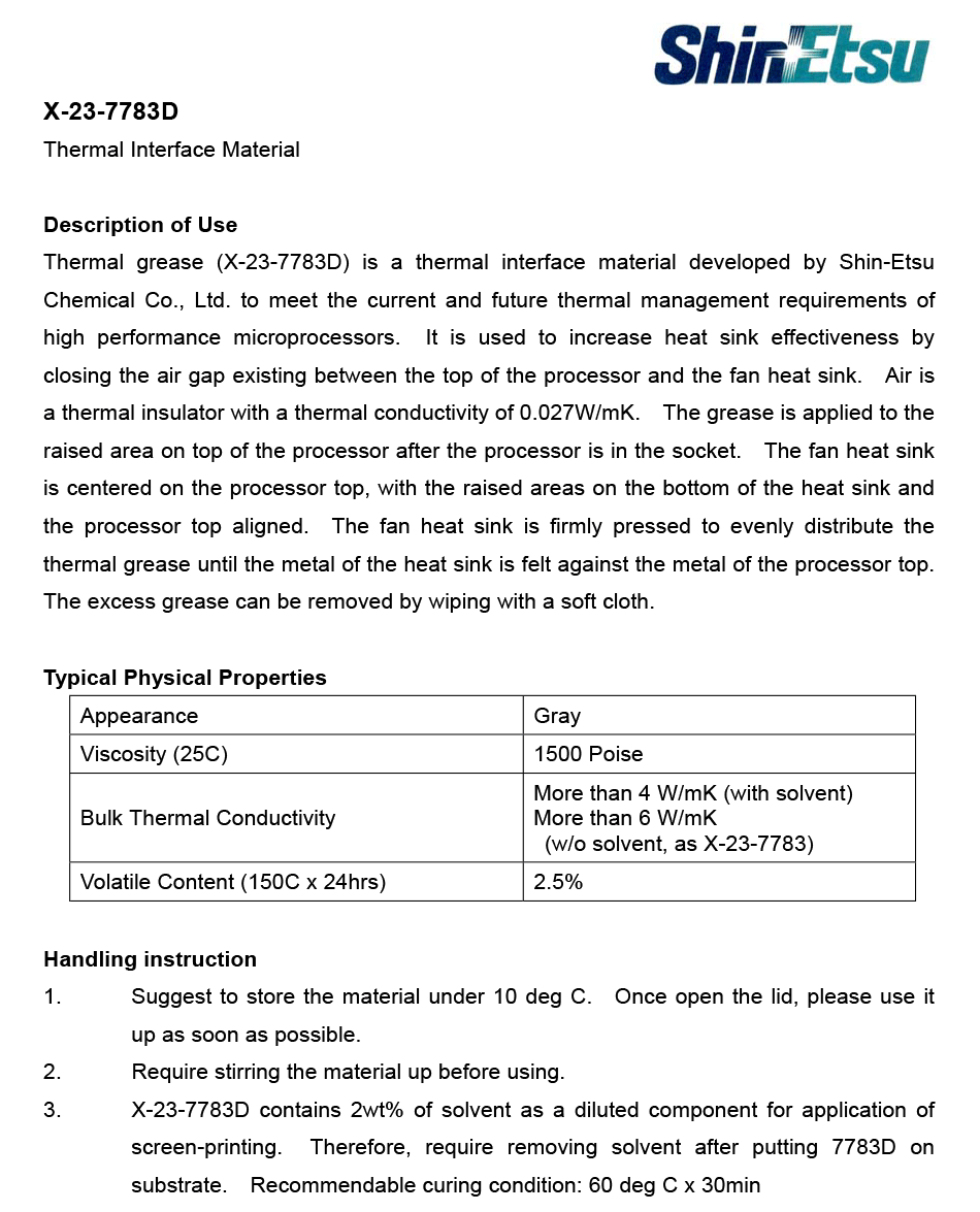 日本信越X-23-7783-D导热硅脂的具体参数如下: