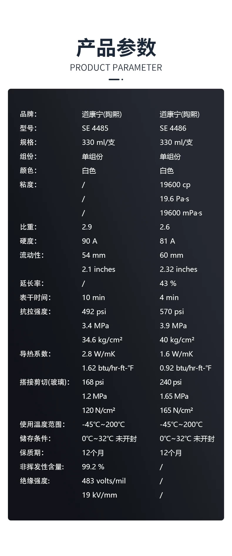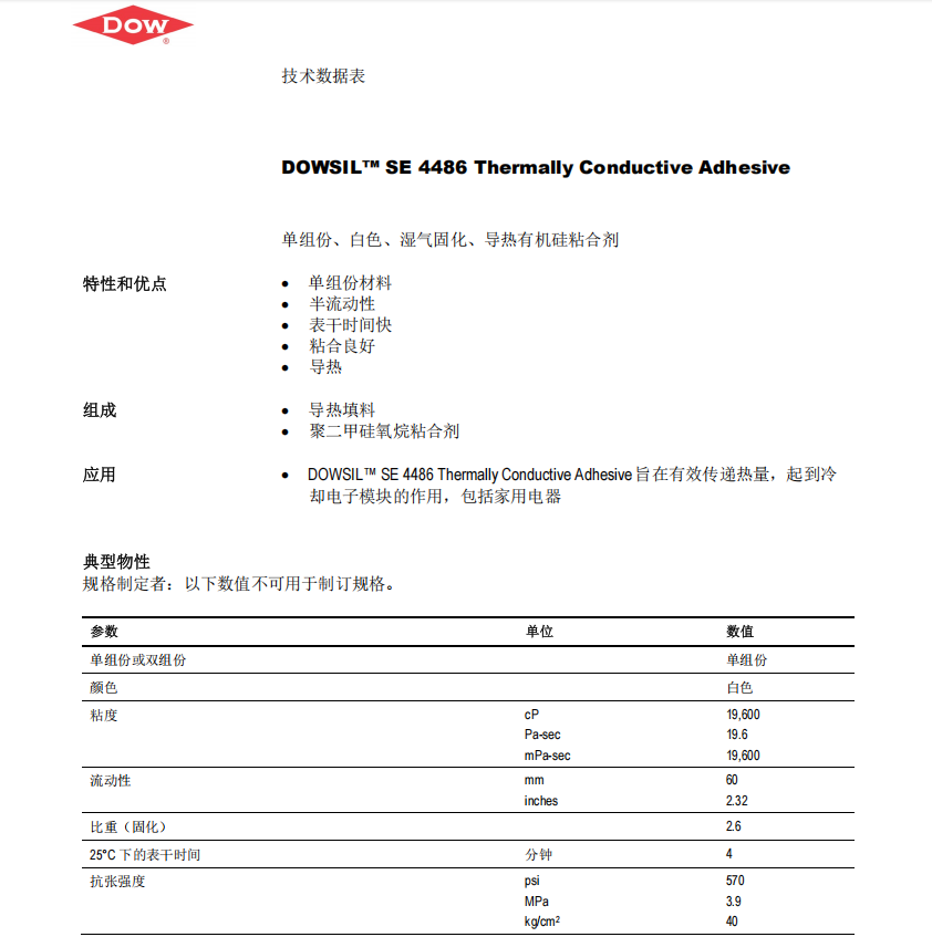美国陶熙SE4486导热胶粘剂的具体参数如下: