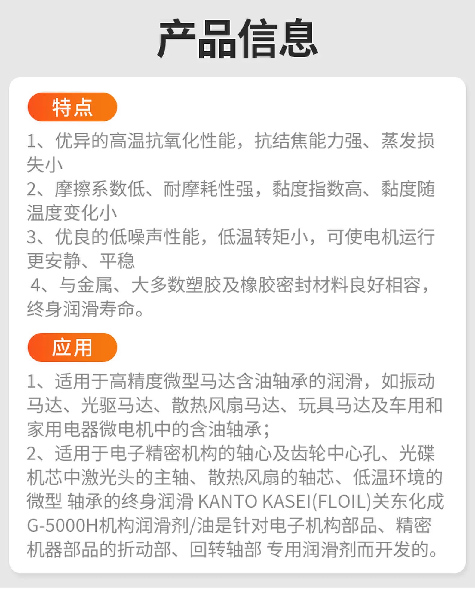 总的来说,关东化成G-5000H是一款综合性能优异的润滑脂,特别适合需要在低温、极压环境下运行,且对噪音控制、材料相容性和环保安全有较高要求的精密机械和电子设备。
